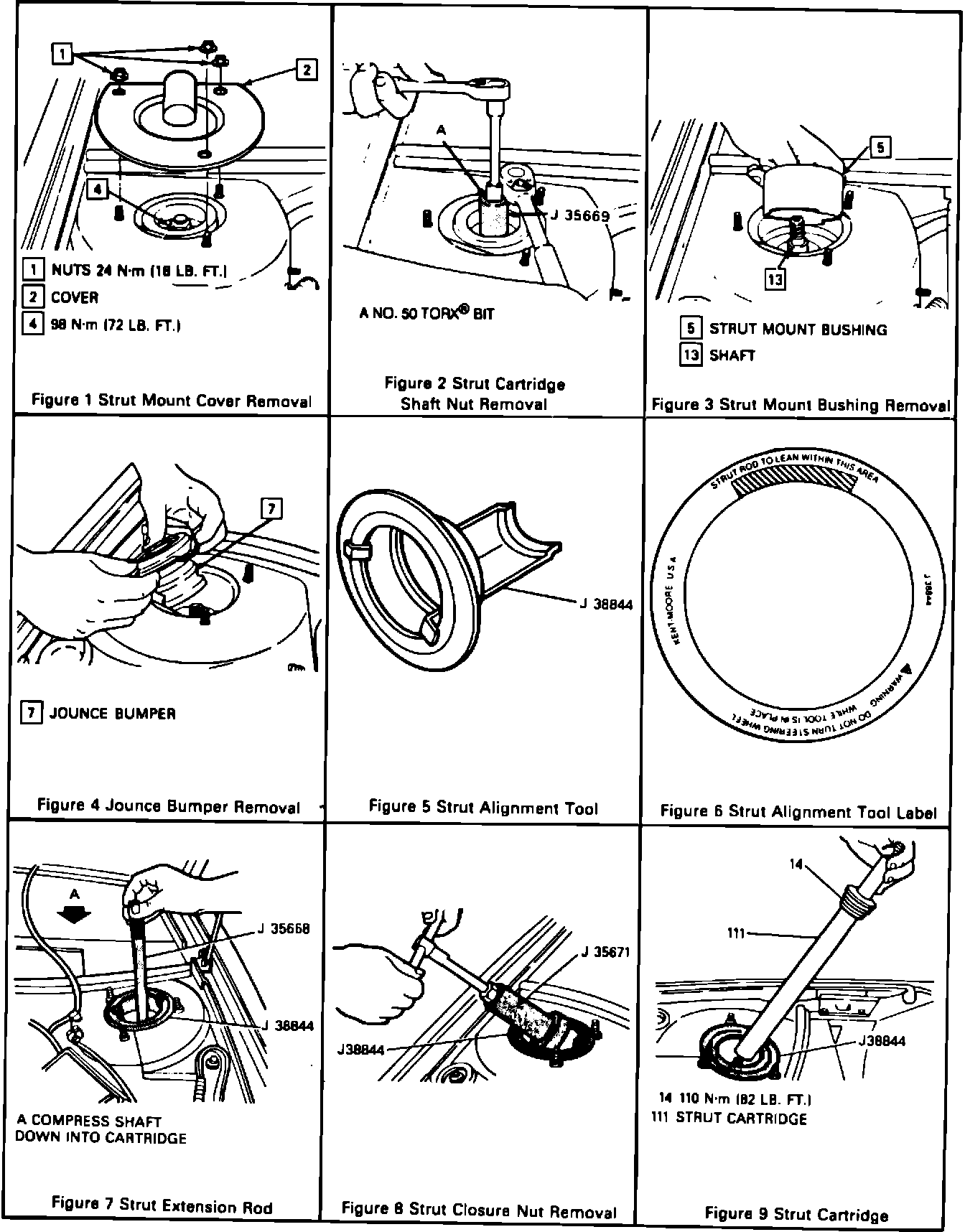 8. Strut shaft nut (4) using No. 50 Torx(R) bit and J 35669 tighten to 98 N-m (72 lbs.ft.).