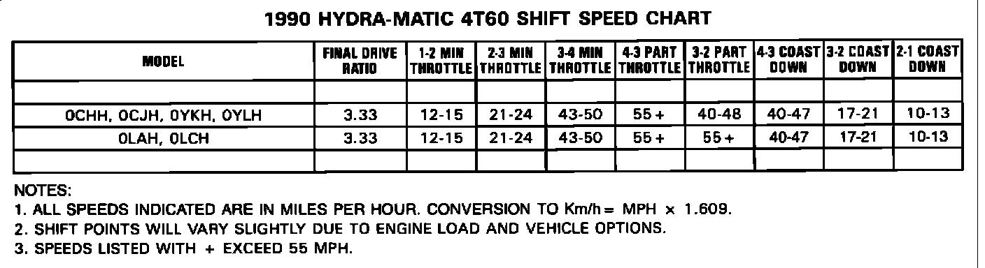 The 1990 HYDRA-MATIC 4T60 transaxle shift speed and oil pressure charts have been changed for the new 3.1L engines.