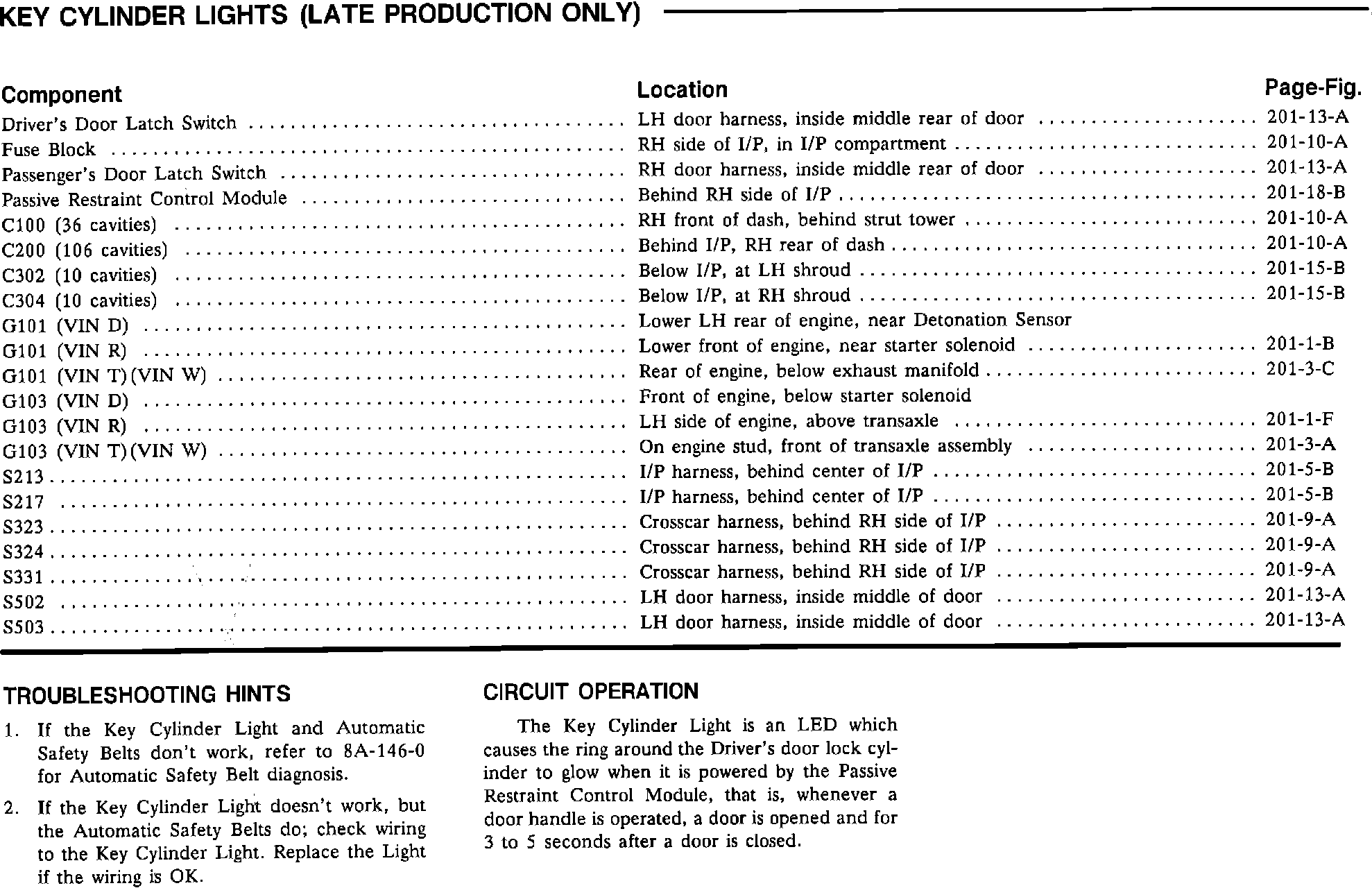 This bulletin is being issued to add diagnosis (see page 3 and 4) and replacement procedures for the illuminated door lock cylinder and lamp assembly. Please mark a reference to this bulletin in the Table of Contents in Section 8A and Section 10, page 10-5-12.