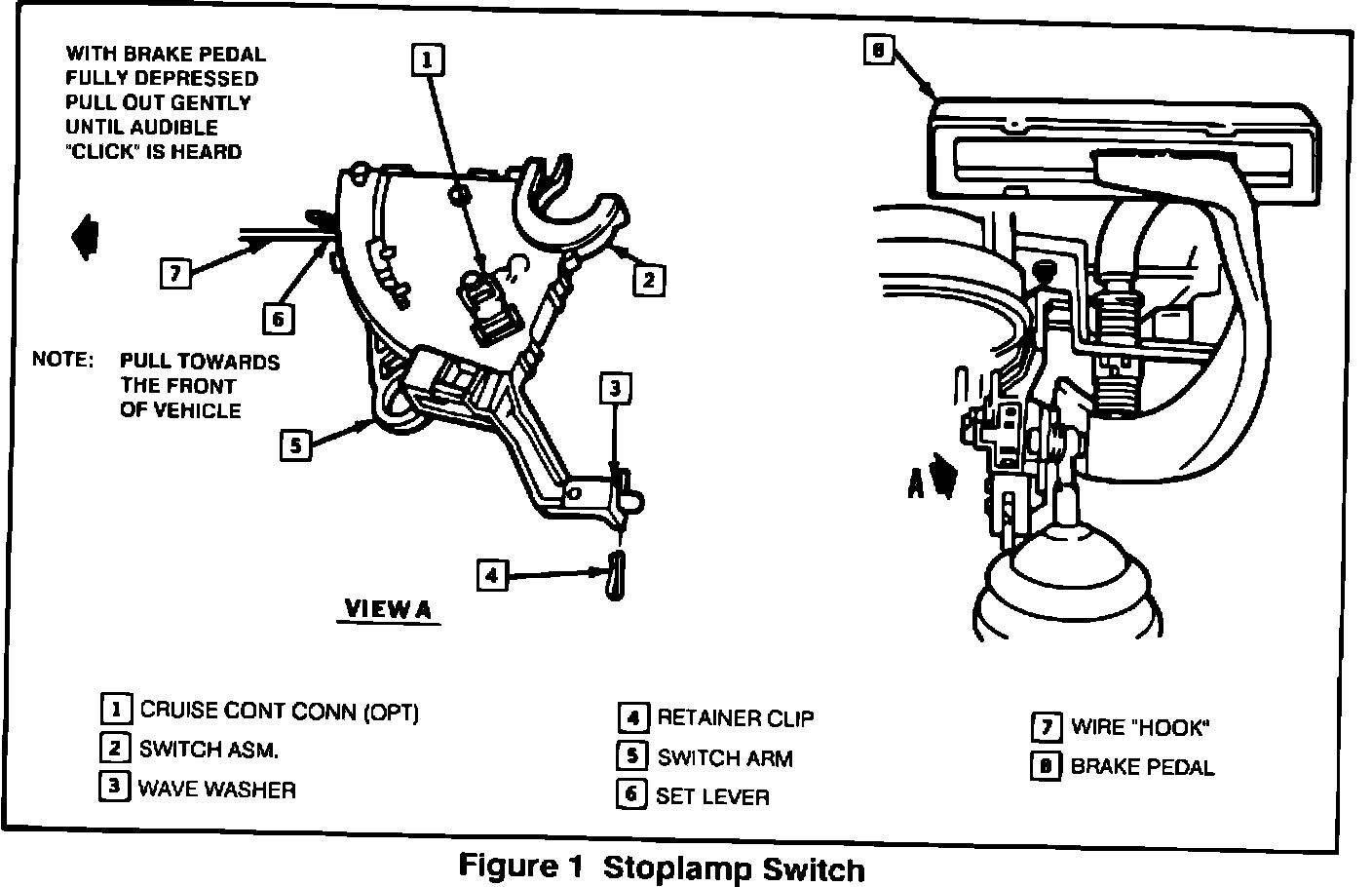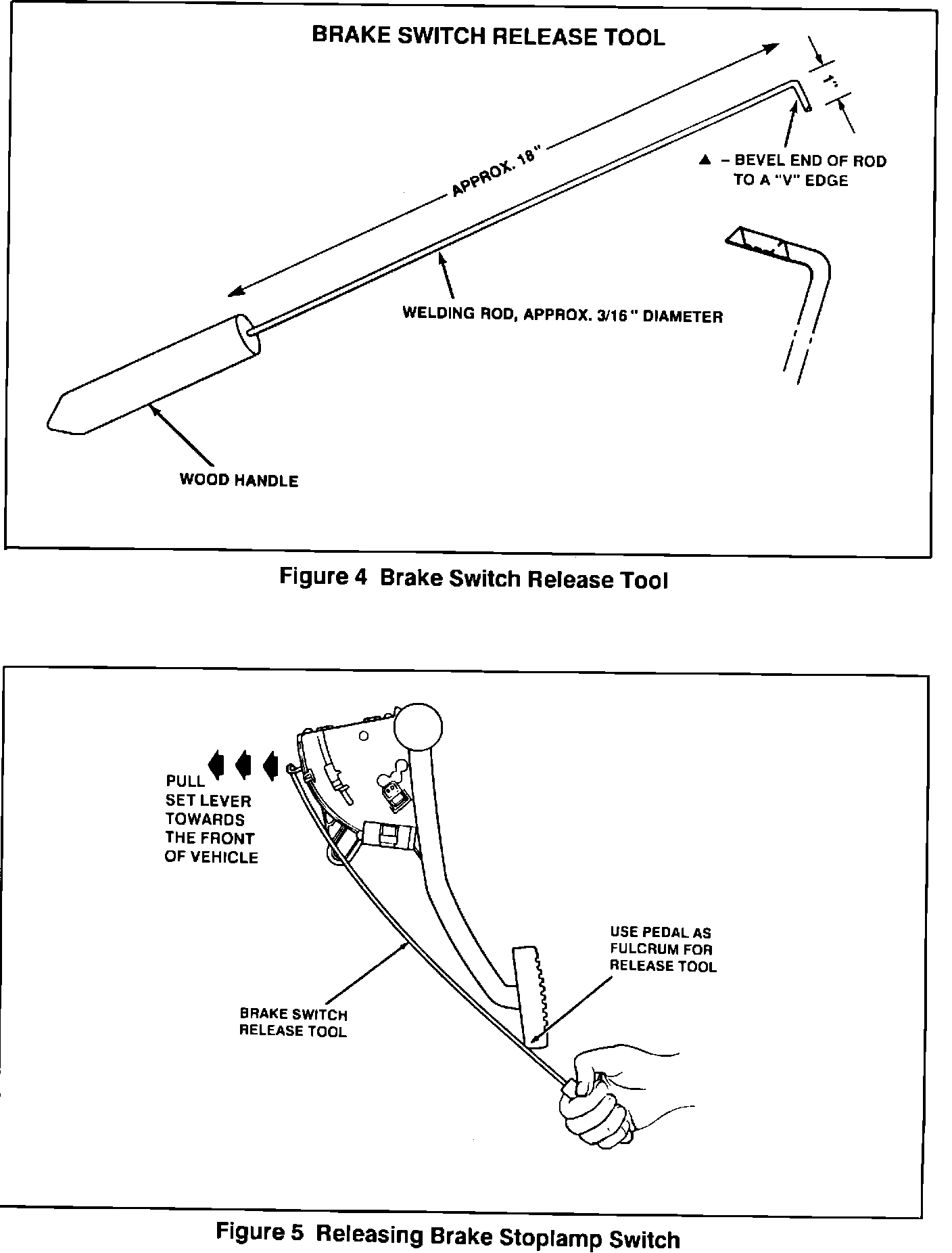 2. Using a stiff wire with a hooked end (See Figures 1, 4 and 5), gently pull the switch set lever forward (toward front of vehicle), and listen for an audible click indicating release of the automatic adjustor.