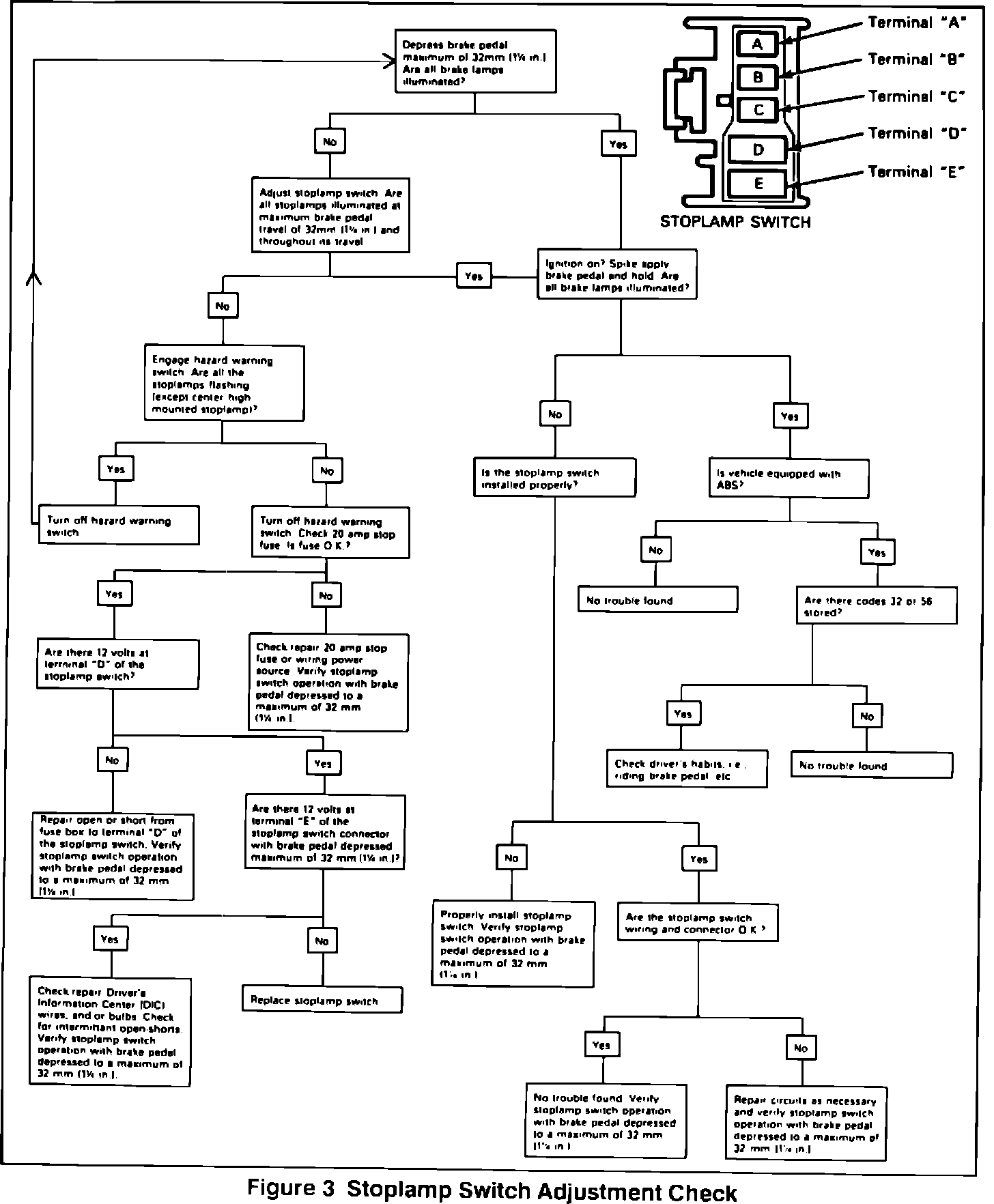 4. Inspect the operation of the stoplamps. Stoplamps should operate at a maximum brake pedal travel of 25 mm (i in.) and throughout the remainder of the pedal travel. If the stoplamps do not operate properly, repeat the switch adjustment procedure one more time. If the switch still fails to operate properly, refer to the "STOPLAMP SWITCH ADJUSTMENT CHECK" chart.