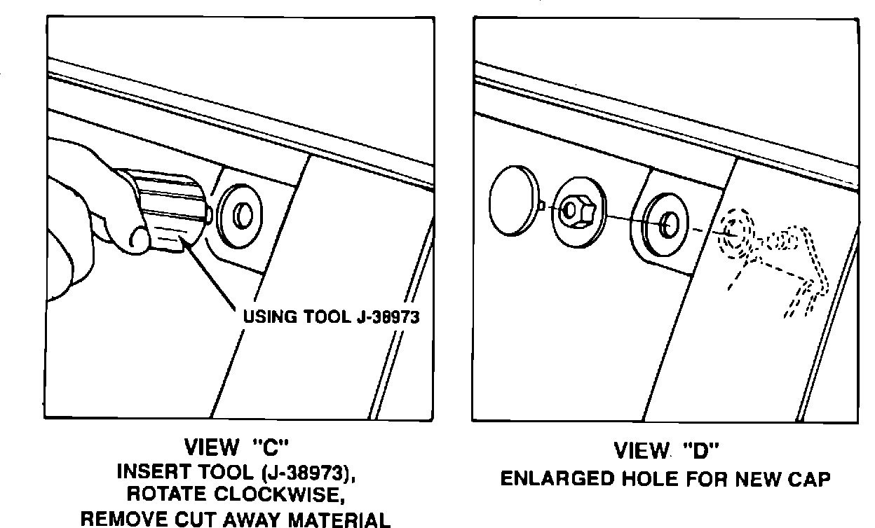 3. Insert pilot shaft of cutting tool J 38973 into the anchor plate hole and while firmly pressing inboard, rotate the tool clockwise 360 degrees several times. Remove the tool and the material cut away from the plastic anchor plate cover. See Figure 2, View "C" and View "D".