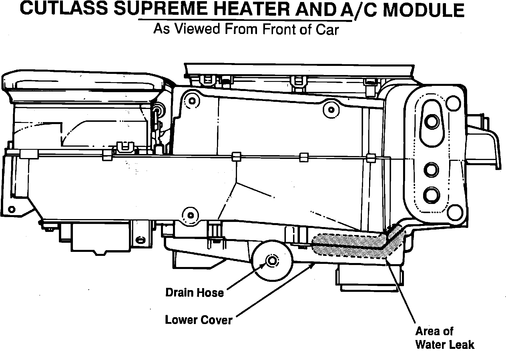Some of the above vehlcles have been reported as having water leaking from the Heater and A/C module. This water leak is coming from the lower front slde of the module, as shown in Figure 1.