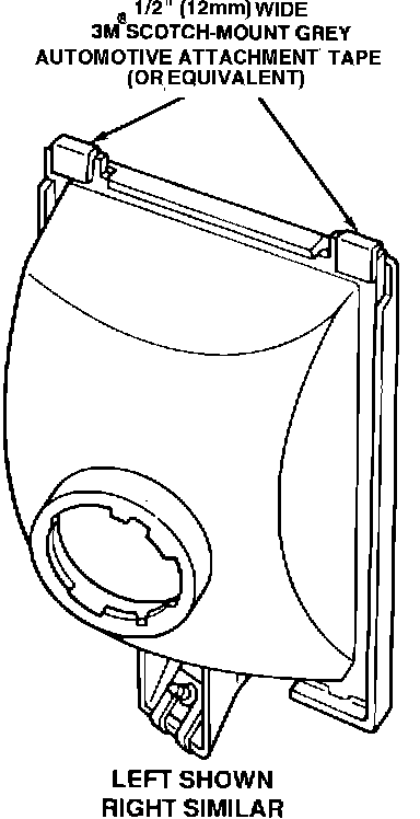 4. Apply 12 mm (1/2 inch) wide 2-sided foam tape such as 3M(R) Scotch-Mount Super Automotive Attachment Tape (3M(R) # 06382) or equivalent to the two lamp retaining tabs on the lower edge of the lamp. The tape should start on the front side of the tab and wrap around to the back side as shown in the illustration.