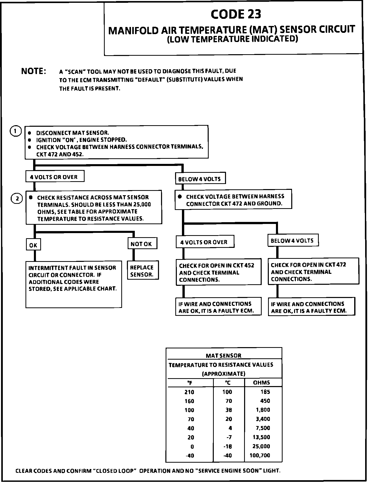 Code 23 will set if signal voltage indicates a manifold air temperature below -40 C (-40 F) for 4 seconds. Due to the conditions necessary to set a Code 23, the "SEVICE ENGINE SOON" light will only stay "ON" while the fault is present.
