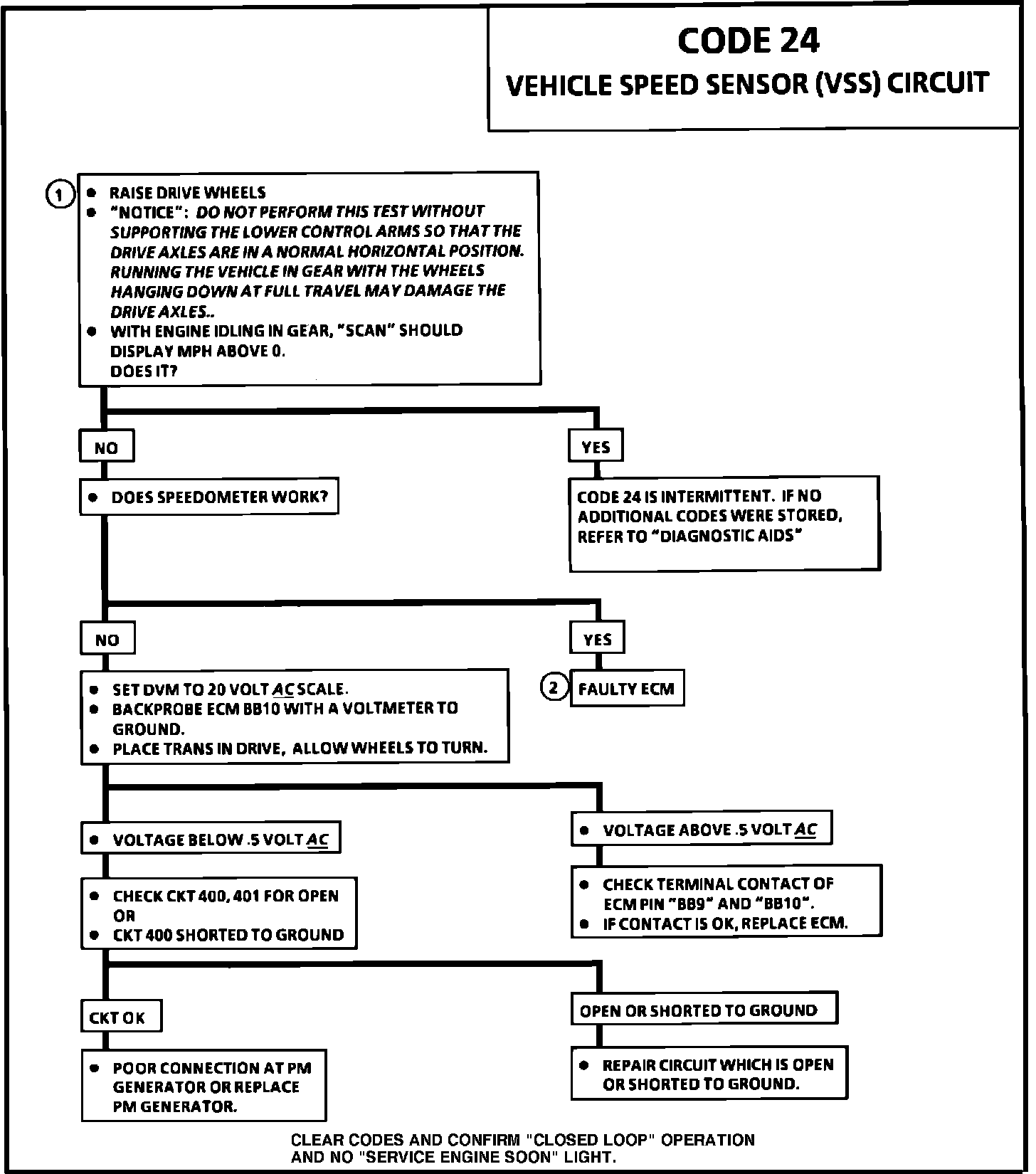 1. Code 24 will set if vehicle speed signal equals less than 3 mph when: