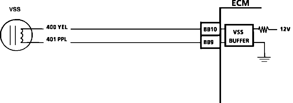 Vehicle speed information is provided to the Electronic Control Module (ECM) by the Vehicle speed Sensor (VSS), in the transaxle. The A/C voltage level and the number of pulses increases with vehicle speed. The ECM converts the pulsing voltage to mph, and the mph can be displayed with a scan tool. The function of the VSS buffer, used in past models years has been incorporated in the ECM. The ECM supplies the necessary signal for the instrument panel (4004 pulses per mile) for operating the speedometer and the odometer.
