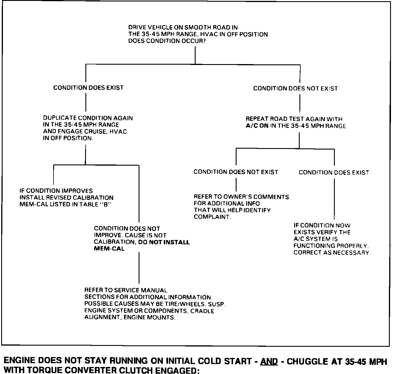 If the vehicle's basic engine controls and fuel systems are operating properly, it is important for the technician to familiarize themselves with information contained in Dealer Technical Bulletin 91-T-16 "Recommended fuels for port fuel injection engines". If the condition cannot be repaired by changing fuel or using currently published service and diagnostic procedures, it may be necessary to install a revised calibration MEM-CAL. Install MEM-CALS listed in Table A for "Engine Does Not Stay Running On Initial Cold Starts" only. See Dealer Technical Bulletin 91-T-139 for MEM-CAL installation.