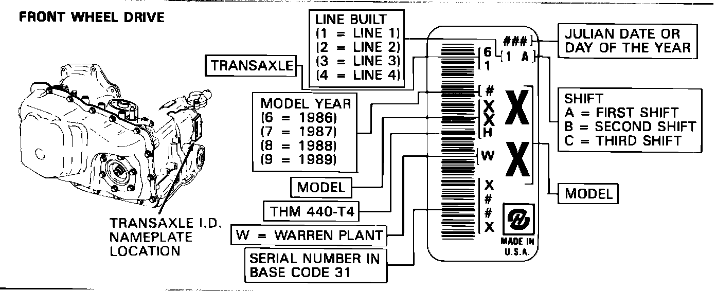 FIGURE 1 - THM 440-T4 TRANSAXLE IDENTIFICATION INFORMATION: