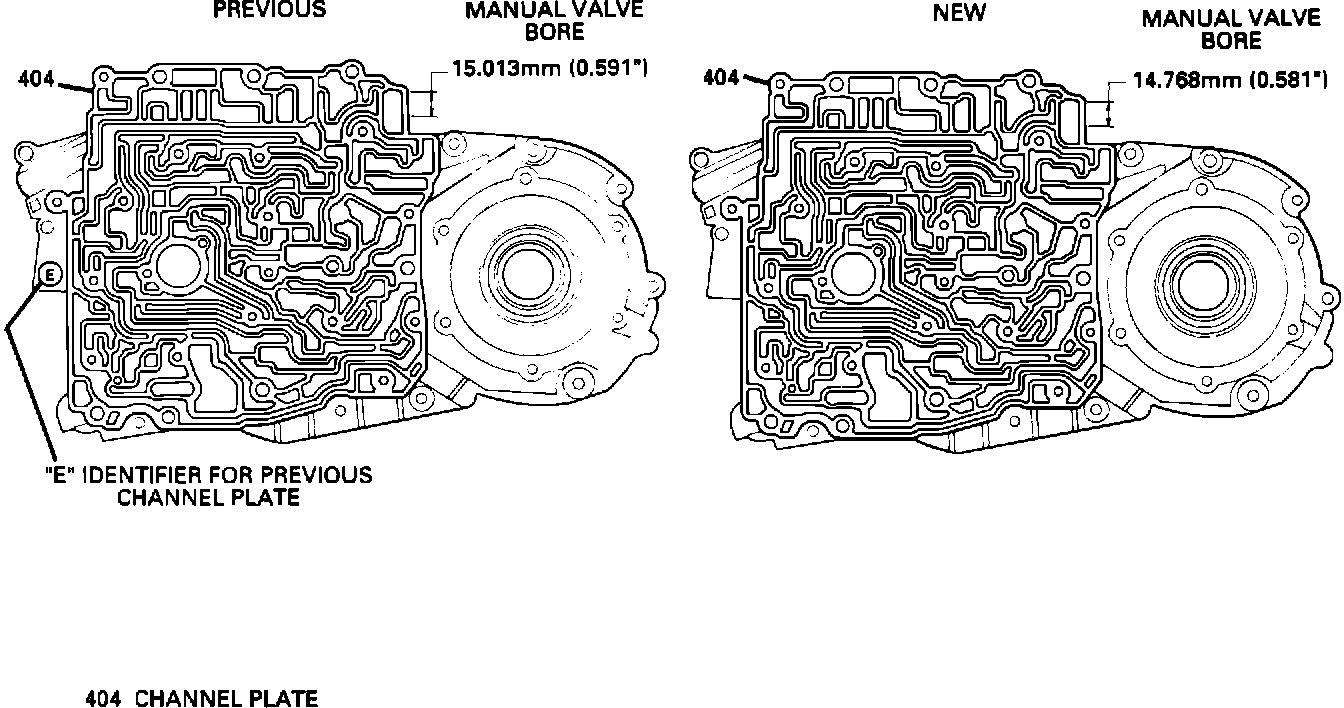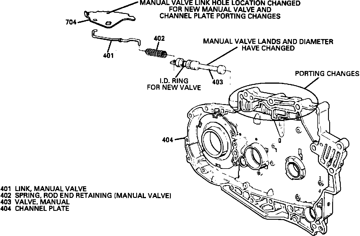 - New channel plate (404) will have porting changes for the new manual valve and new inside detent lever. The porting changes will help ensure that two ports will never be opened at once to cause distress to the 4th clutch assembly when the shift cable is not set correctly or is kinked or binding. The bore for the new manual valve will be reduced to accommodate the manual valve. This will make the new and previous parts noninterchangeable. The new manual valve and inside detent lever must be used with the new service channel plate. Only the new service channel plate will be available for 1985-1/2 through 1990 models.