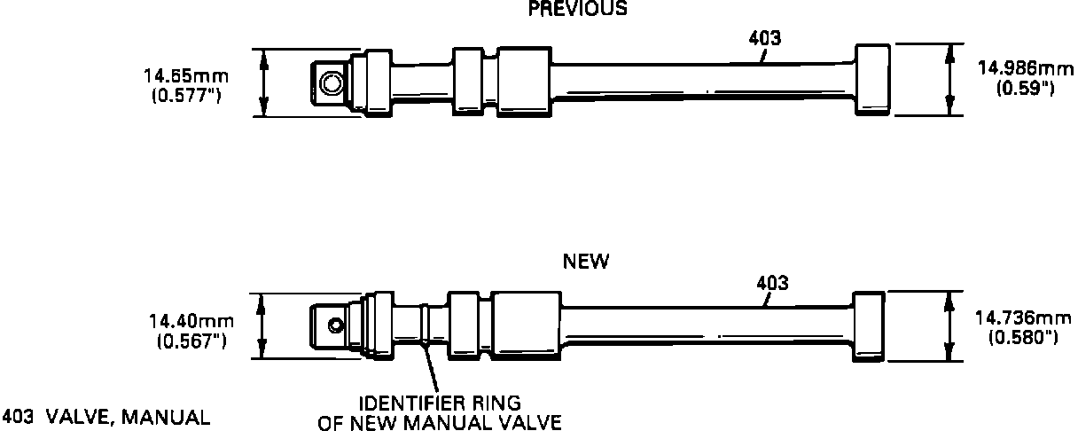 - New manual valve (403) will have changes to the valve lands and be reduced 0.25 mm (0.010") in diameter for the new porting changes to the service channel plate. The previous and new manual valves are not interchangeable. The new manual valve will assemble into the previous channel plate but the transaxle will not function because of excessive leakage due to the differences in sizes.