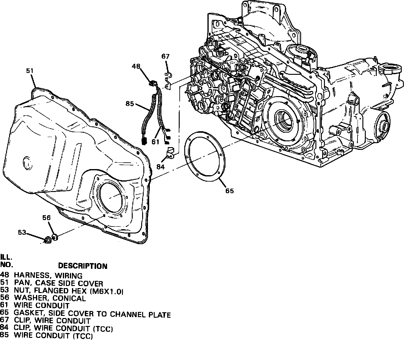 A revised wire routing for the Torque Converter Clutch Solenoid (TCC) requires a new Wiring Harness. The TCC wires are now routed straight down from the Engine Wire Harness Connector to the TCC Solenoid instead of going around the Oil Pump Body. This reduces the possibility of the TCC wires becoming pinched/shorted between the Pump Cover and the Case Side Cover Pan during assembly. For this change to occur, a Wire Conduit Clip (TCC) has been added to secure the Wire Conduit (TCC).