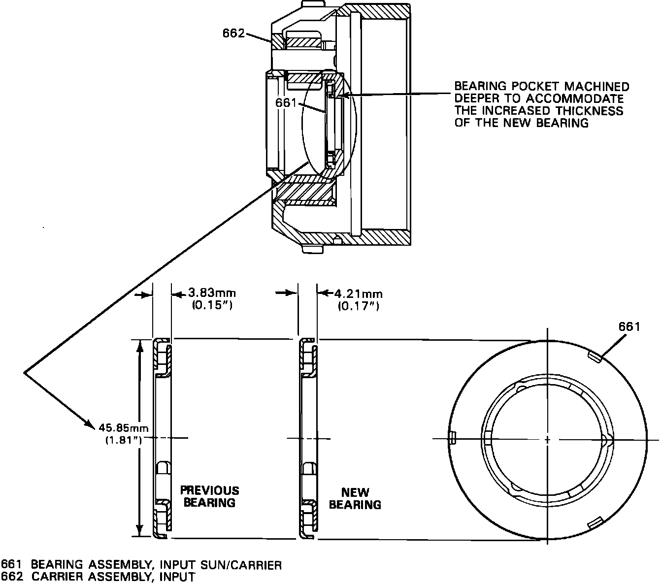 A new Input Sun Gear to Input Carrier Thrust Bearing Assembly that has increased torque capacity for higher torque engines. The new Input Sun/Carrier Bearing Assembly (661) is 0.38mm (0.015") thicker and the Input Carrier Assembly (662) Bearing Pocket is machined deeper to accommodate the increased thickness of the new Bearing (Figure 3).