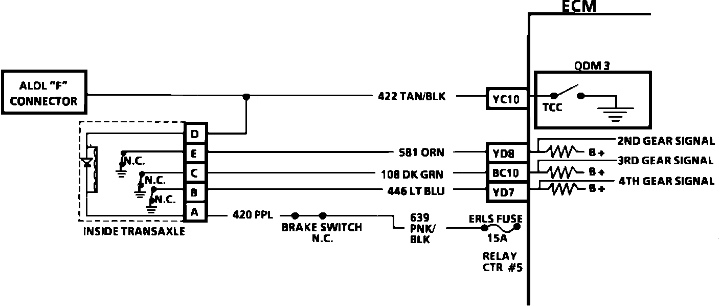2. Determines whether the switch or signal circuit is open. The circuit can be checked for an open by measuring the voltage at the TCC connector. Should be about 12 volts.