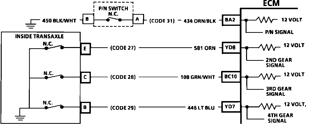 The gear switches are located inside the transaxle. They are pressure operated switches, normally closed. The ECM supplies 12 volts through each selected circuit to the switch. In any condition other than the specific gear application, the signal line monitors low voltage, low potential. As road speed increases, hydraulic pressure applies the specific gear clutches and the gear switch opens. At this time, the ECM monitors a high, 12 volt potential, and interprets this to indicate that gear is applied. The ECM uses the gear signals to control fuel delivery (and TCC).