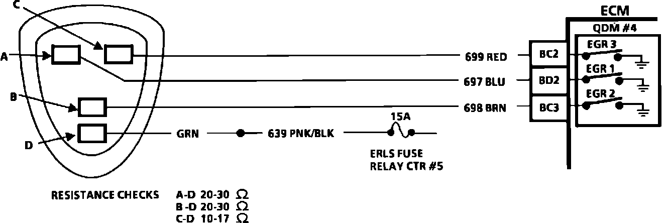 If a code is set, inspect the EGR for damage. Disconnect the 4 wire connector at EGR. Install a fused jumper from the battery to terminal "D" of the EGR. Start and idle engine, and with a jumper, ground terminals "A," "B," & "C" one at a time. You should be able to note a change in engine rpm as the terminal is grounded. Terminal "A" should result in a small change and "C" in a large change.