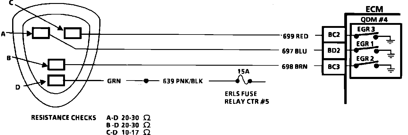 Disconnect the four wire connector at the EGR, and then install a jumper wire, with a fuse, from the battery to terminal D of the EGR.
