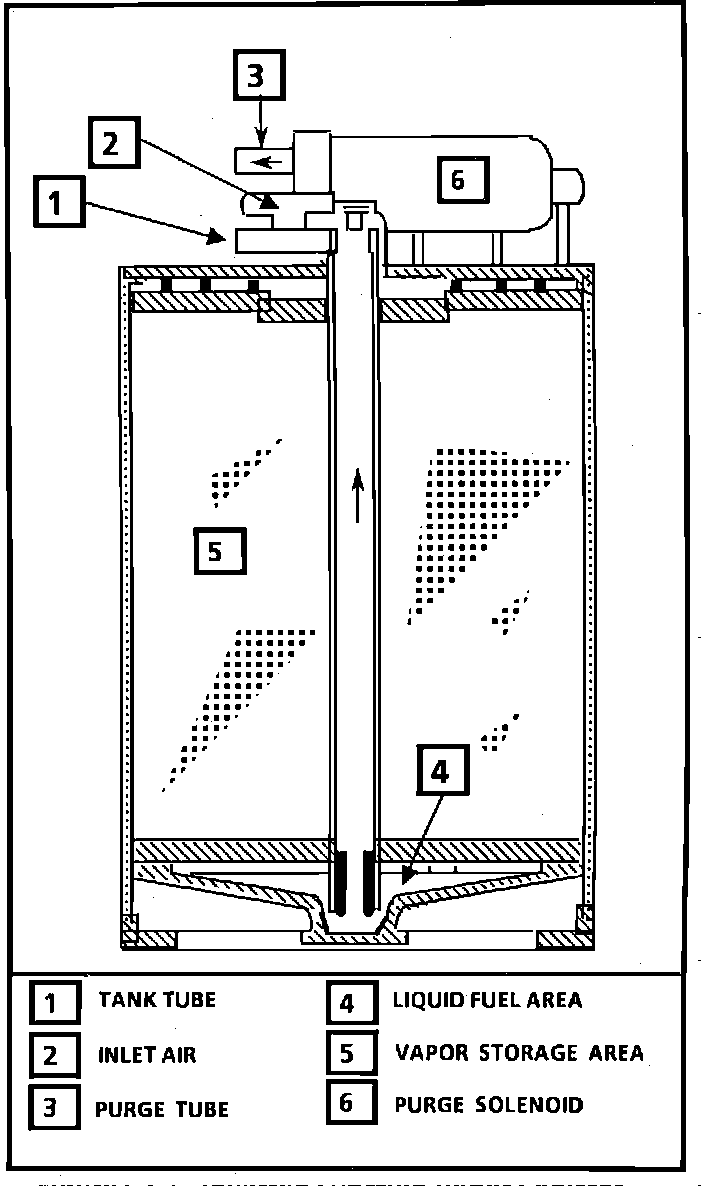 Gasoline vapors from the fuel tank flow into the tube labled "TANK". Any liquid fuel goes into a reservoir at the bottom of the canister to protect the carbon bed above. These vapors are absorbed into the carbon. The canister is purged when the engine is running above idle speed, and commanded by the ECM. Ambient air is allowed into the canister through the air tube. The air mixes with the vapor and is drawn into the intake manifold.