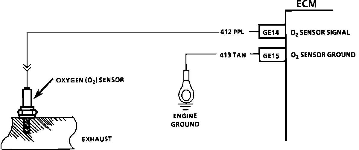 The ECM supplies a voltage of about 0.45 volt between terminals "GE14" and "GE15". (If measured with a 10 megohm digital voltmeter, this may read as low as 0.32 volt.) The 02 sensor varies the voltage within a range of about 1 volt if the exhaust is rich, down through about 0.10 volt if exhaust is lean.