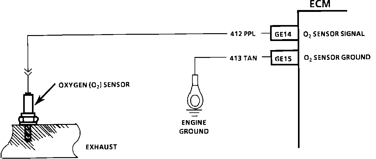 The ECM supplies a voltage of about 0.45 volt between terminals "GE14" and "GE15." (If measured with a 10 megohm digital voltmeter, this may read as low as 0.32 volt.) The 02 sensor varies the voltage within a range of about 1 volt if the exhaust is rich, down through about 0.10 volt if exhaust is lean.
