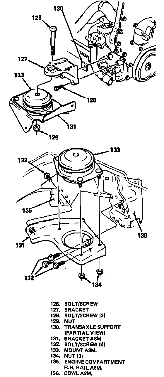 2. Position engine and transaxle assembly under engine compartment and slowly lower vehicle over the assembly until transaxle mount is indexed and install bolt.