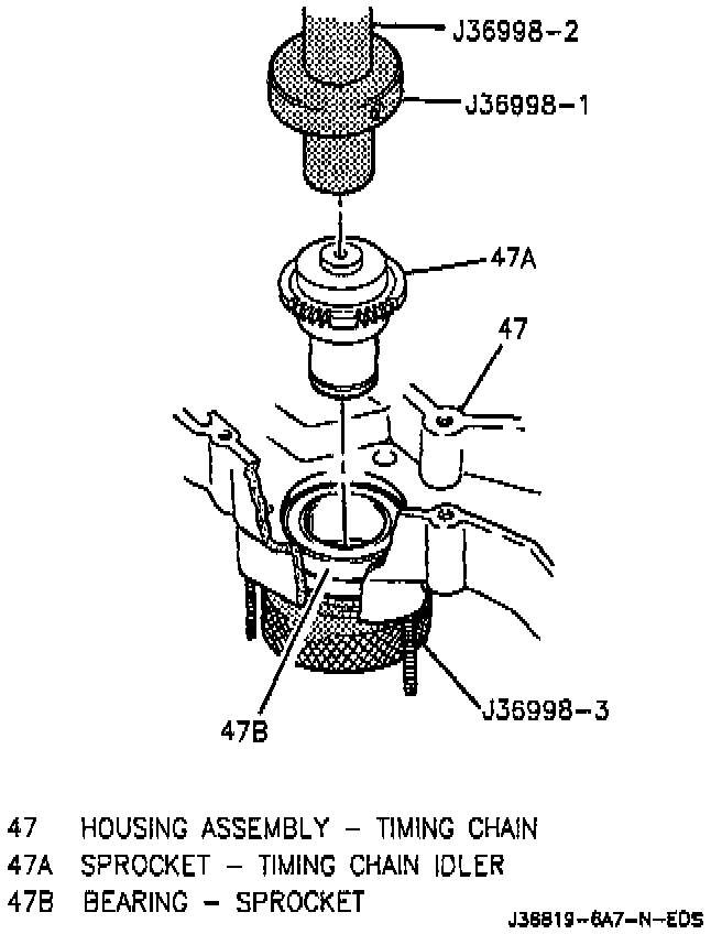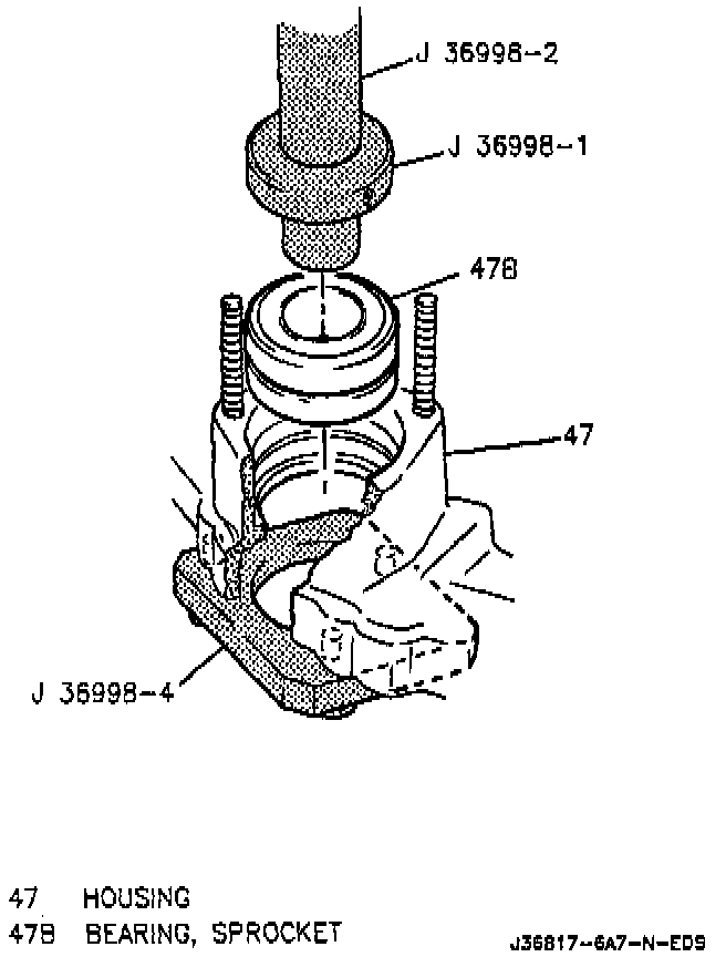 2. With J 36998-4 or equivalent installed on the front of the chain housing, install the new bearing into the chain housing using J 36998-1 and J 36998-2 or equivalents.