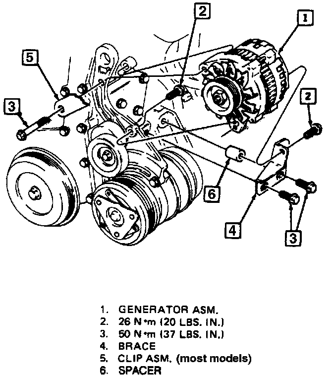 2. Front generator bolt and engine harness clip, hand tight.