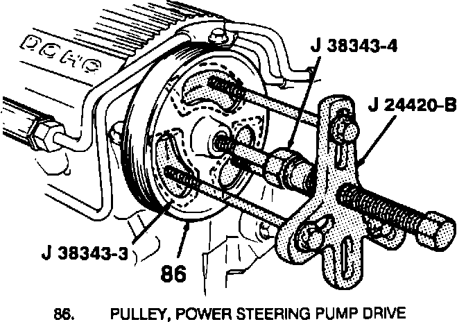 4. While holding J 38343-4 with a wrench, remove pulley with pulley remover J 38343.