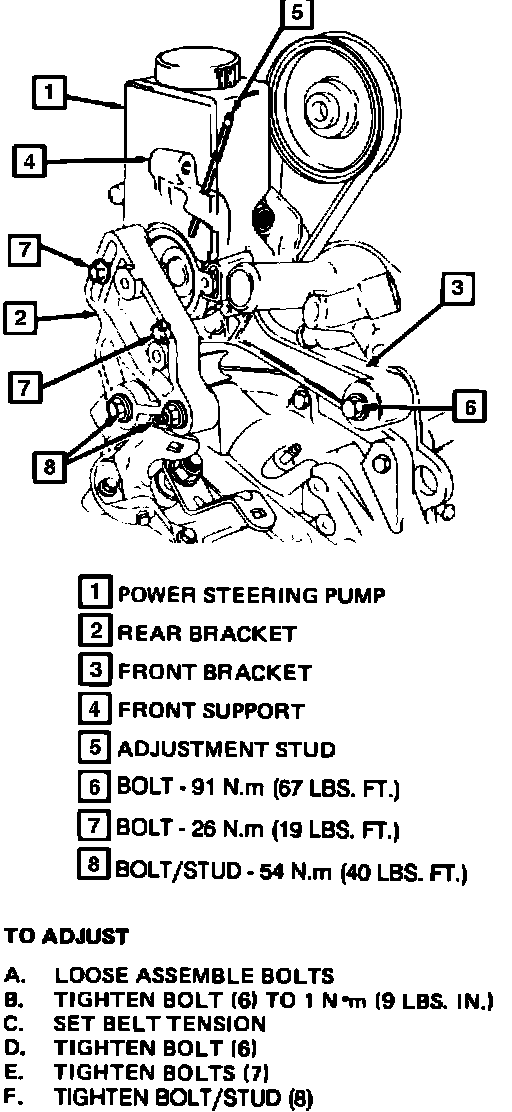 6. Reposition and install power steering pump assembly, leaving adjustment bolts slightly loose.