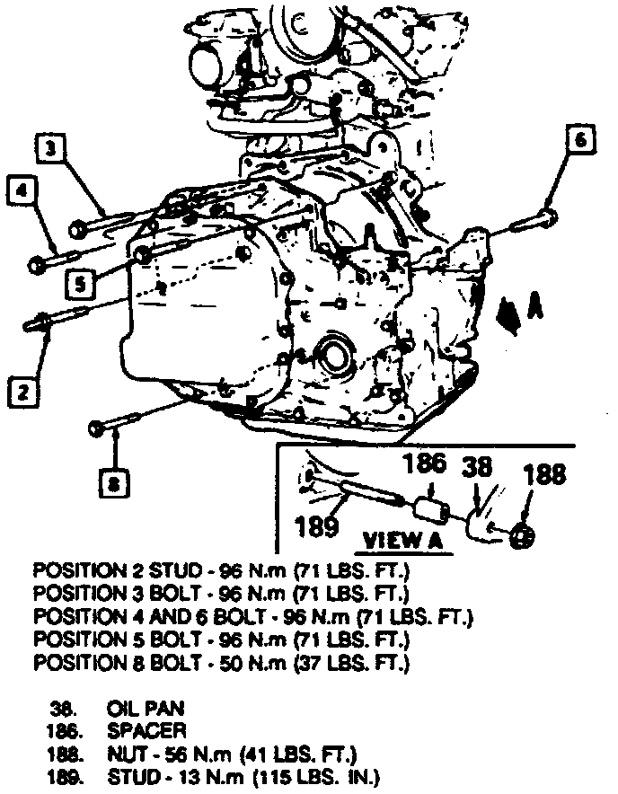 c. Torque transaxle to engine brace bolts to 44 ft lbs; engine to transaxle bolts as shown. Flywheel to torque converter bolts to 46 ft lbs; transaxle mounting bolts to 32 ft lbs.