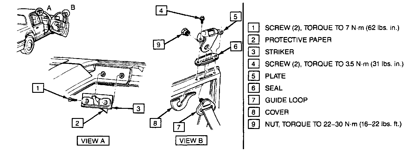 CAUTION: The striker and plate make the door interlock with the roof rail in a crash. If someone were to remove them. the door couldn't interlock with the roof rail in a crash and might spring open. People inside could be thrown out of the car much more easily with the door open. Be sure you never remove the striker or the plate when you're doing repair work around them.