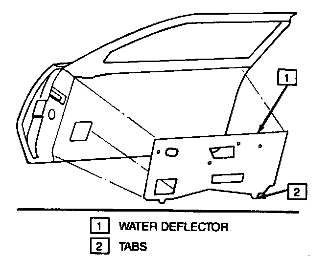 1. Water deflector to door inner panel, making sure that tabs (2) on bottom of the deflector are in slots in the bottom of the door inner panel and that original fastener holes in deflector are located in original position.