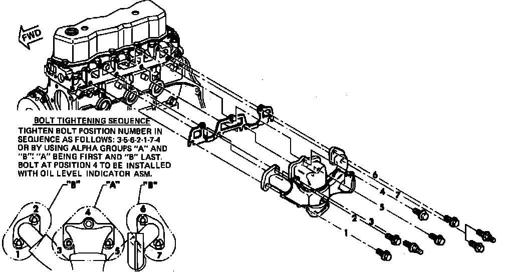8. Reverse procedure to install. Torque attaching bolts in sequence, Fig. 5. Torque bolts 1, 2, 6 and 7 to 26 ft. lbs. and bolts 3, 4 and 5 to 37 ft. lbs.