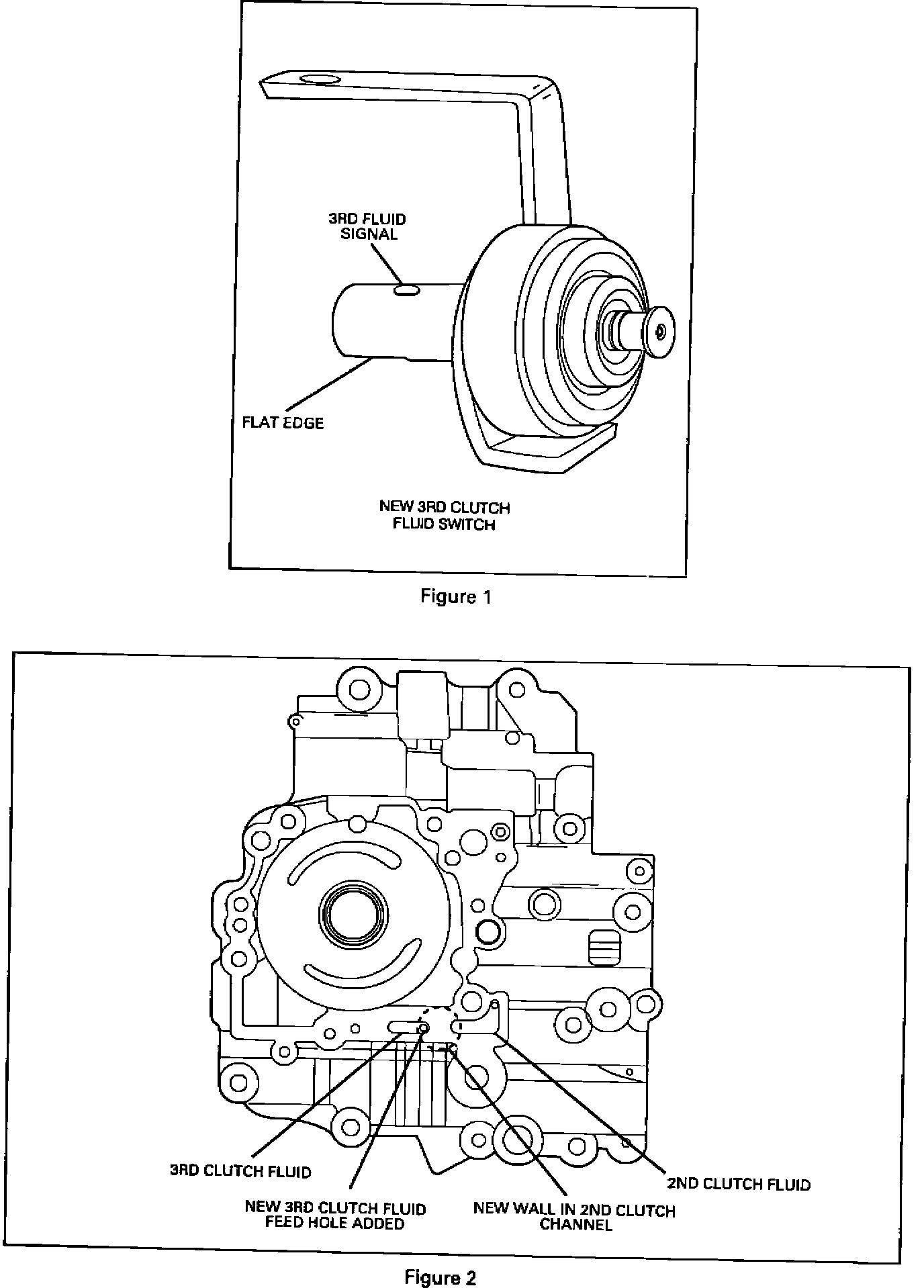 New 3rd fluid reroute of 3-2 downshift fluid for a more consistent 3-2 downshift feel at high altitude areas. This consists of a new 3rd clutch fluid switch with external bracket, and modification of the control valve assembly and auxiliary valve body and gasket to allow a faster flow of 3rd signal fluid to the 3rd clutch fluid switch during 3-2 downshifts while maintaining 3rd clutch fluid to the orifice control valve.