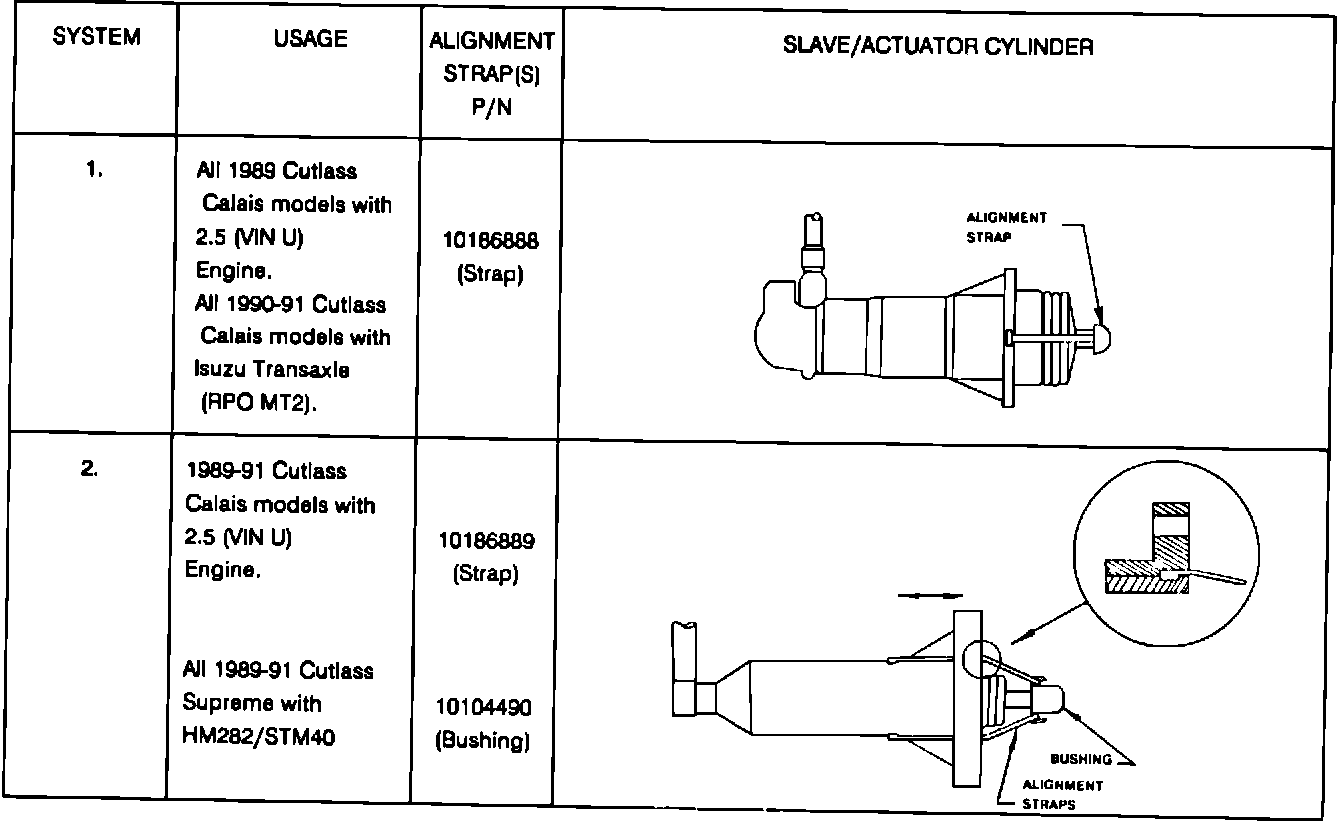 If the removed hydraulic clutch system is to be reused, the slave/actuator cylinder alignment strap must immediately be installed onto the slave/actuator cylinder to prevent any accidental extension of the slave/actuator cylinder push rod. See the illustration for applicable alignment strap part numbers. This strap is required for the alignment of the push rod to the clutch fork during reinstallation.
