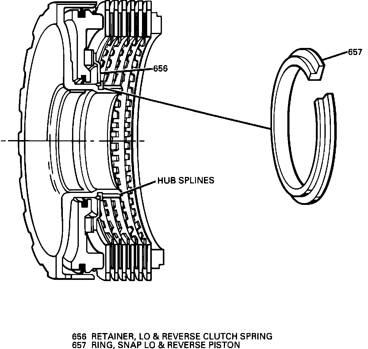 Whenever installing the Lo-Reverse Clutch piston snap ring (657), the step on the outside diameter of the snap ring must be positioned toward the Lo-Reverse Clutch retainer (656). The retainer must rest inside the snap ring to allow proper piston travel.