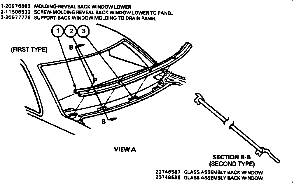 The old glass assembly, part numbers 20745202 or 20745204, have been deleted from service because it will not work as a replacement part for current production. The welded on mounting stools for the back window lower reveal molding have been eliminated. Replacement on Eighty-Eight vehicles built prior to VIN 1G3HN54CPKH304129 will also use the new glass assembly (20748587 or 20748588). This can be done by removing the hat section stools used for mounting the lower reveal molding. Figure 2.