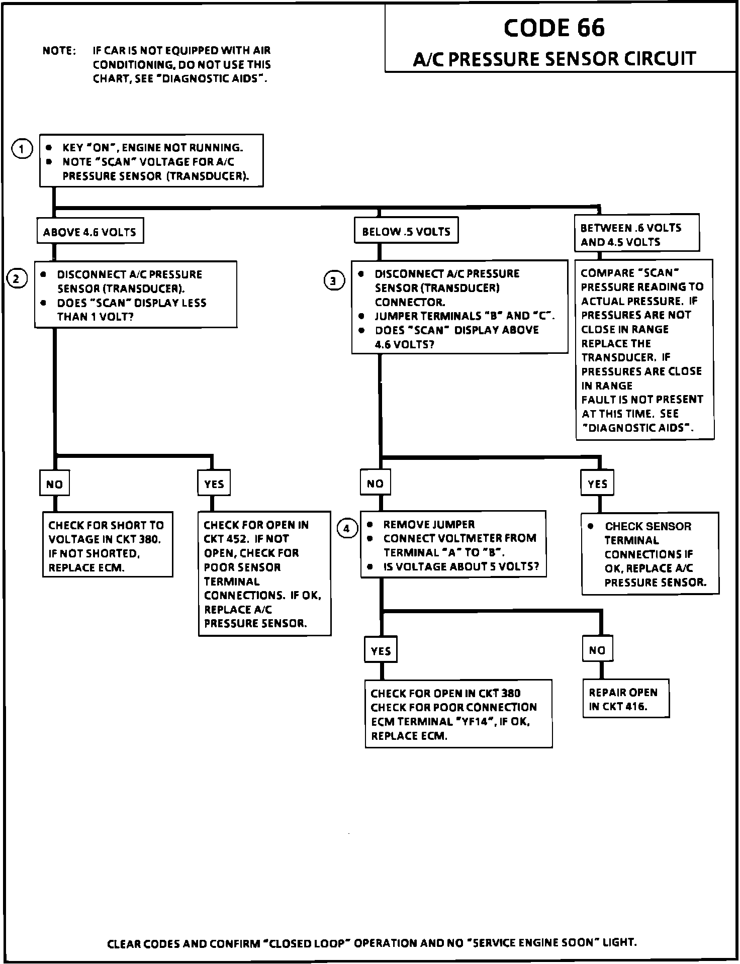 Code 66 sets when signal voltage falls outside the normal possible range of the sensor and is not due to a refrigerant system problem. If problem is intermittent, check for opens or shorts in harness or poor connections. If OK, replace A/C pressure sensor, If Code 66 re-sets, replace ECM.