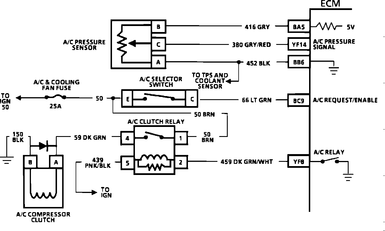 The A/C pressure sensor responds to changes in A/C refrigerant system high side pressure. This input indicates how much load the A/C compressor is putting on the engine and is one of the factors used by the ECM to determine IAC valve position for idle speed control. The circuit consists of a 5 volts reference and a ground, both provided by the ECM, and a signal line to the ECM. The signal is a voltage which is proportional to the pressure. The sensor's range of operation is 165 to 399 psi. At 165 psi or less, the signal will be about 0.5 volt, varying up to about 4.5 volts at 399 psi or above. Code 66 sets if the voltage falls outside of calibrated minimum and maximum values for 25 seconds or more while the A/C is requested "ON." The A/C compressor is disabled by the ECM if Code 66 is present.