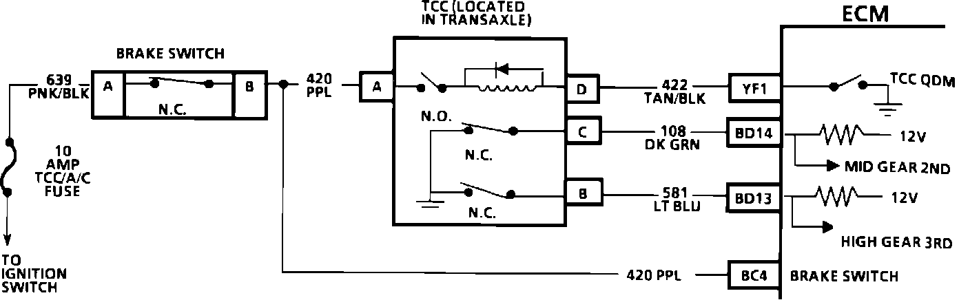 The purpose of the torque converter clutch feature is to eliminate the power loss of the transmission converter stage when the vehicle is in a cruise condition. This allows the convenience of the automatic transmission and the fuel economy of a manual transmission. Fused battery ignition is supplied to the TCC solenoid through the brake switch, and transmission 2nd gear apply switch. The ECM will engage TCC by grounding CKT 422 to energize the solenoid.