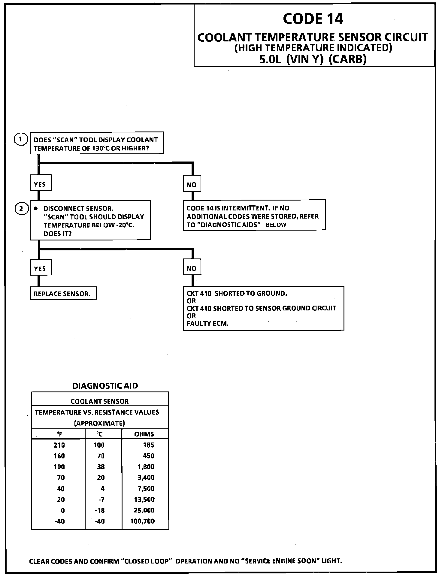 1. Code 14 will set if. O2 Signal voltage indicates a coolant temperature above 167 degrees C (333 F) for 90 seconds or more.
