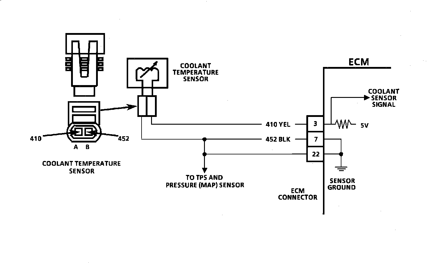 The coolant temperature sensor uses a thermistor to control the signal voltage to the ECM. The ECM applies a voltage on CKT 410 to the sensor. When the engine is cold the sensor (thermistor) resistance is high therefore, the ECM will see high signal voltage. As the engine warms, the sensor resistance becomes less and the voltage drops. At normal engine operating temperature 180 degrees F to 203 F (85 C to 95 C) the voltage will measure about 1.5 to 2.0 volts.