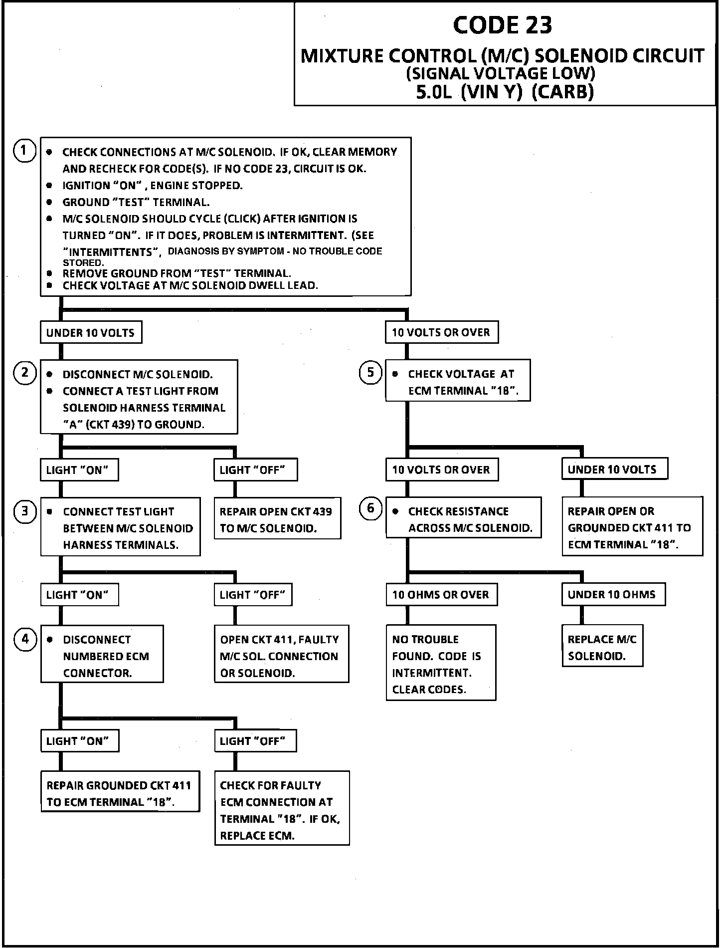 Code 23 indicates that the ECM has monitored the voltage at ECM terminal "18" and it was staying low, instead of rising and falling as the M/C solenoid is turned "ON" and "OFF." This could be caused by an open in the M/C solenoid circuit or a ground on the ECM side of the M/C solenoid. An open would cause a full rich condition and cause poor fuel economy, odor, smoky exhaust and/or poor driveability. A ground would cause a full lean condition and poor driveability.