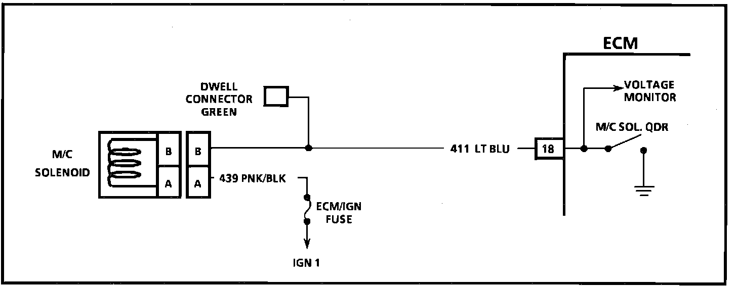 1. Checks for a complete circuit from the battery through the M/C solenoid dwell lead. Voltage here should be battery voltage. Battery voltage indicates there may be an open CKT 411 between the dwell connector and ground. No voltage reading could be caused either by an open between the dwell connector and ignition source or a grounded wire on the ECM side of the M/C solenoid.