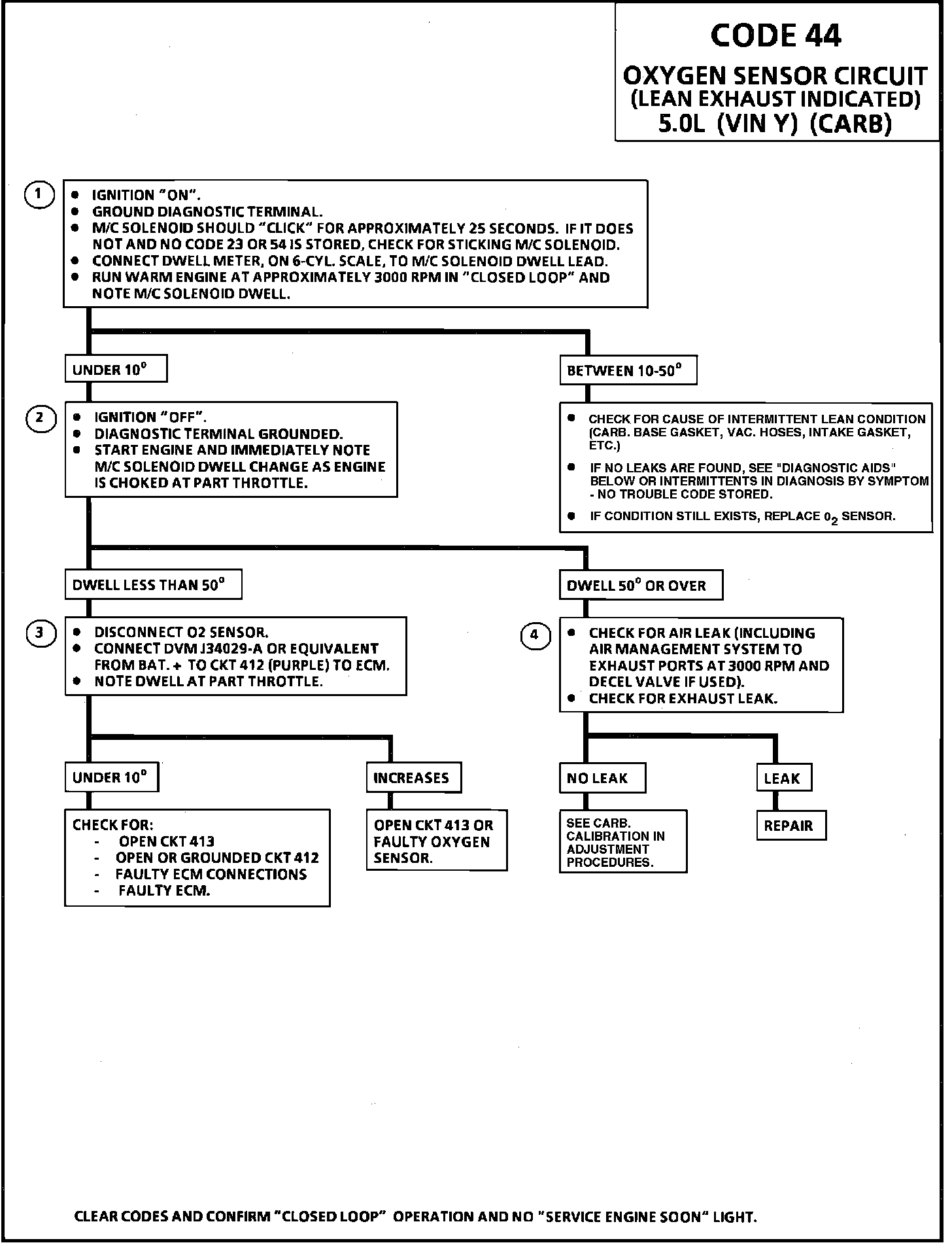 Verify proper TPS operation, see CHART C-2F. Check for 02 signal wire shorted to ground. A cylinder misfire may also cause a Code 44. Refer to DIAGNOSIS BY SYMPTOM - NO TROUBLE CODE STORED.