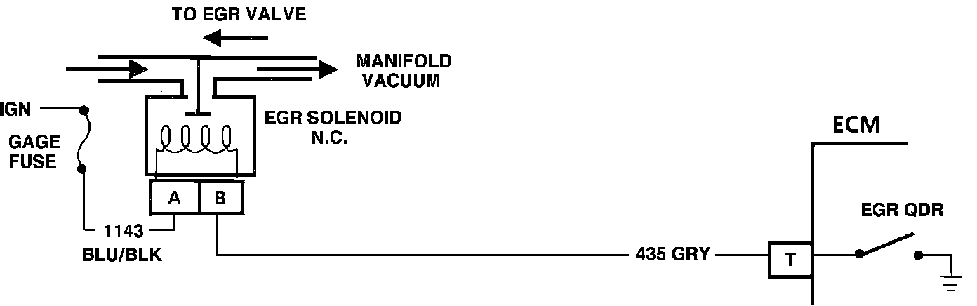 5. With the ignition "ON" and engine stopped, the ECM normally grounds terminal "T" to energize the EGR solenoid. This step checks for a defective (always open) solenoid or an electrical circuit problem.