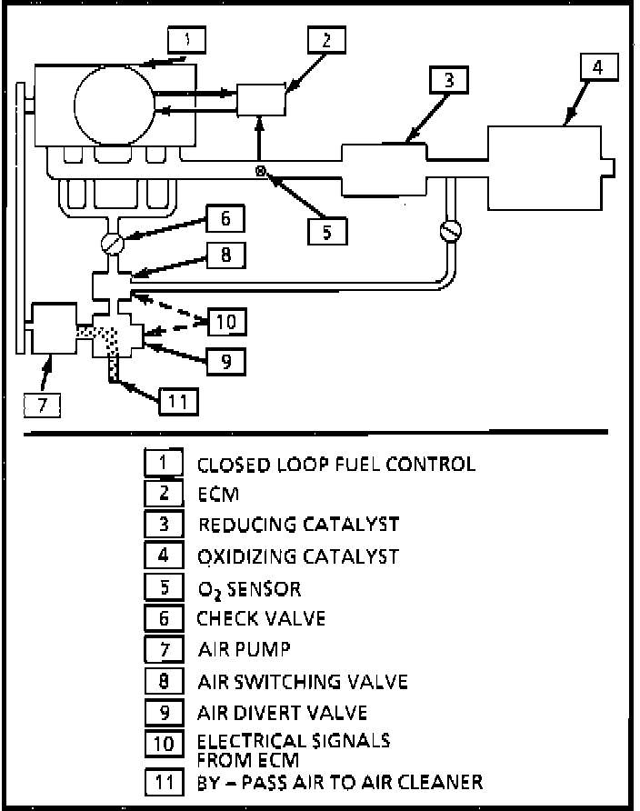 ^ The air switching valve directs air to the exhaust ports during cold engine operation or anytime the fuel control system is in "Open Loop" and between converter beds during warm engine operation and the system is in "Closed Loop."