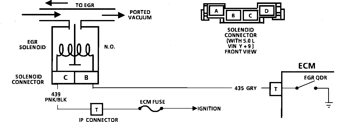 The Exhaust Gas Recirculation (EGR) valve is controlled by a normally open solenoid (allows vacuum to pass when de-energized). When the ECM energizes the solenoid by completing a ground circuit, the EGR is turned "OFF." The ECM controls EGR based on the following inputs: