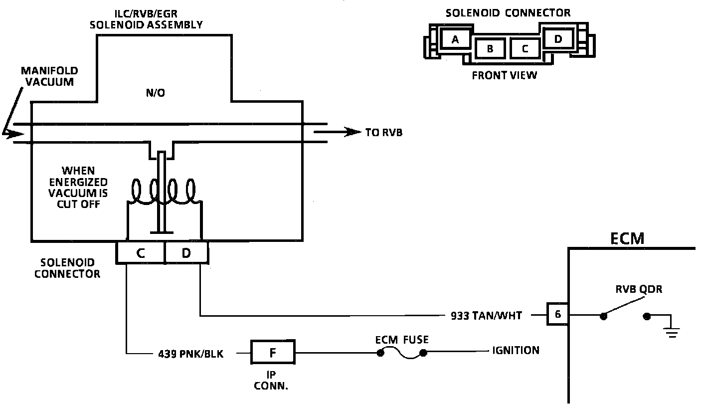 The rear vacuum brake is mounted on the carburetor and is controlled by a rear vacuum brake solenoid. When the solenoid is energized, no vacuum is applied to the RVB allowing the plunger to extend (rich). When the solenoid is de-energized, manifold vacuum will be applied to the RVB and pull the plunger in (lean). The RVB solenoid is controlled by the ECM. Battery voltage is supplied by ignition and the ground is completed by the ECM to energize the solenoid. RVB solenoid is energized for about 30 seconds if the engine coolant temperature is below a calibrated value (approximately 20 degrees C or 65 F). This improves cold driveability by keeping the RVB from applying during initial start-up. Poor cold driveability would result if the RVB is applied during initial start-up.
