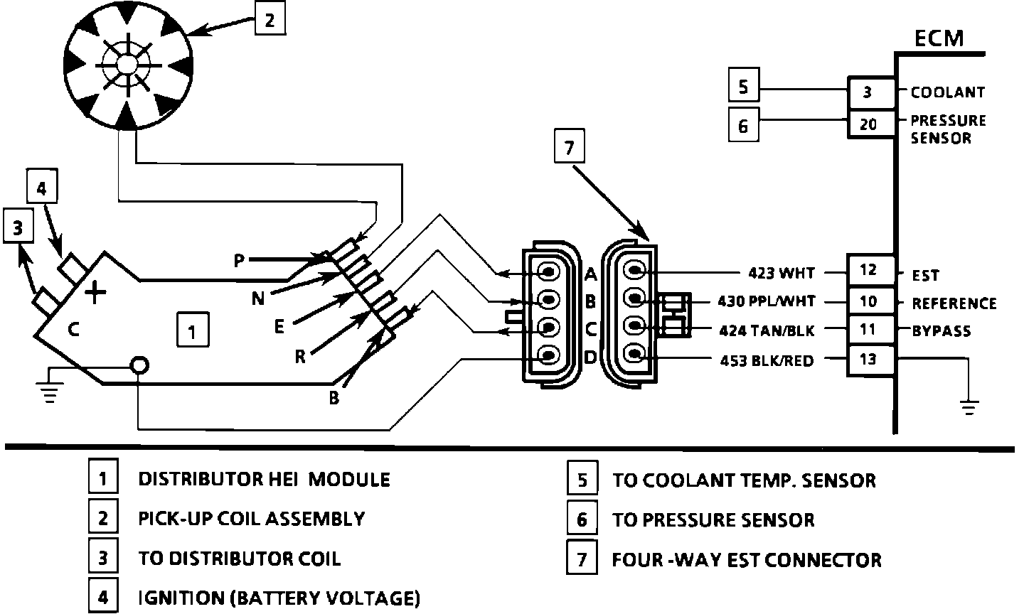 The Electronic Spark Timing (EST) system consists of an HEI module, Electronic Control Module (ECM), and connecting wires. The distributor has four wires that connect the HEI module to the ECM. These circuits perform the following functions:
